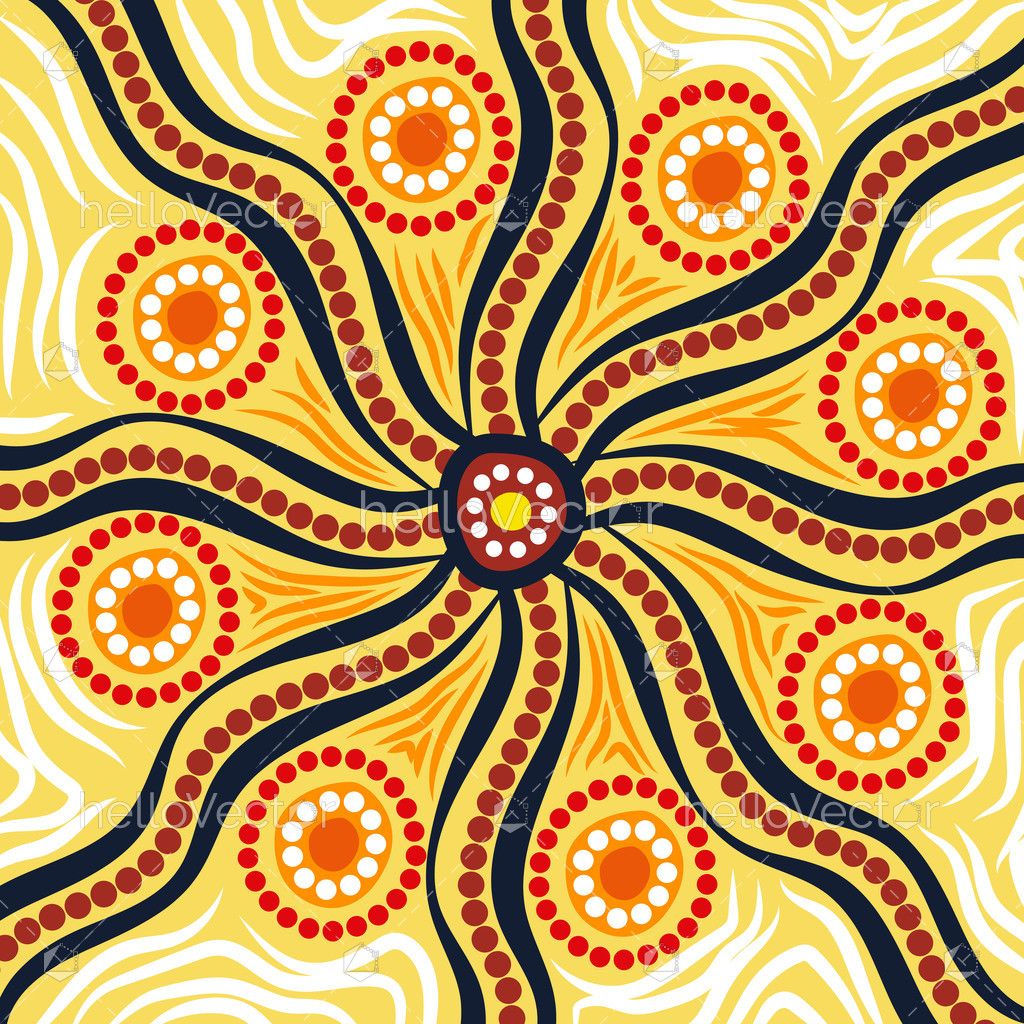 A vibrant Aboriginal-style artwork featuring radiating pathways and sun-like dotted circles in warm yellow, orange, and red tones. The background is a vector graphic, which means it can be scaled and edited without losing quality.