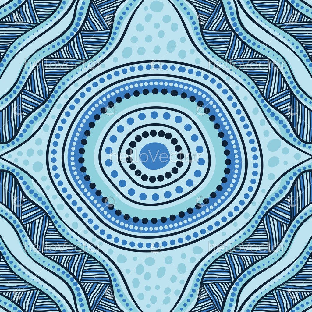 A calming blue-toned artwork featuring concentric circles, flowing lines, and dot patterns symbolizing water, movement, and connection, echoing traditional Aboriginal storytelling motifs.