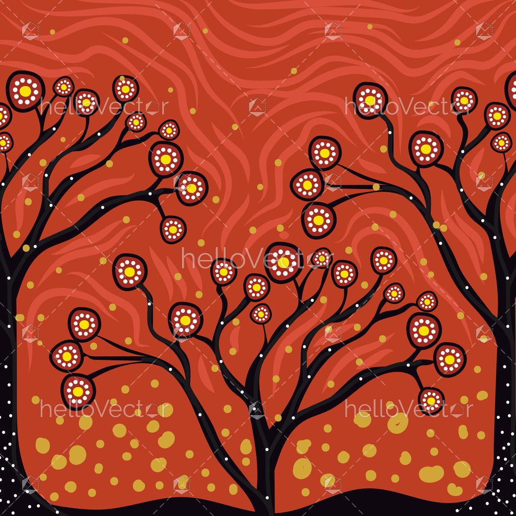 An Aboriginal-style artwork depicting branching trees adorned with circular dot patterns against a warm earthy background. The background is a vector graphic, which means it can be scaled and edited without losing quality.