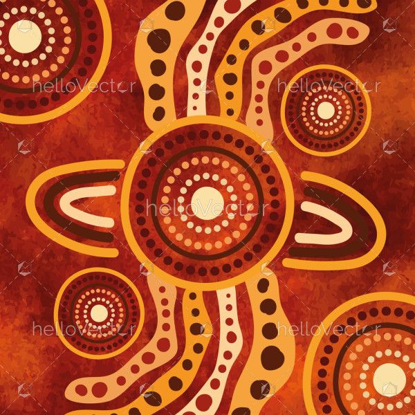 A rich tribal composition featuring circular dot motifs and traditional Aboriginal design elements in warm tones.