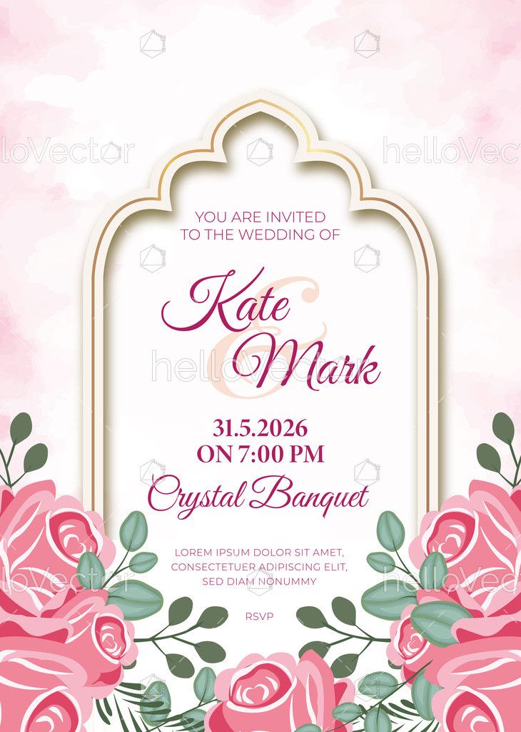 A graceful wedding invitation design featuring a decorative arch frame with gold accents and soft pink roses at the bottom. The layout highlights the couple’s names in stylish script typography, along with the wedding date, time, and venue details. The pastel background and floral arrangement create a romantic and luxurious look, perfect for wedding invitations, reception cards, and save-the-date announcements.