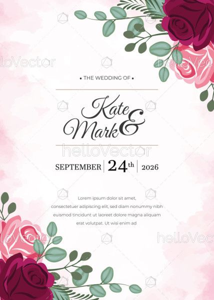 A beautiful wedding invitation template decorated with rich red and pink roses and soft green leaves on a pastel background. The design features elegant calligraphy for the couple’s names and a clean layout for the wedding date and details. This romantic floral composition is ideal for wedding invitations, save-the-date cards, engagement announcements, and luxury stationery designs.