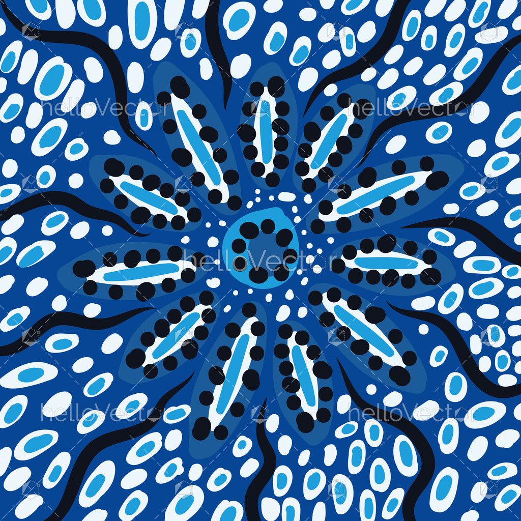 An Aboriginal-inspired artwork with vibrant blues, dots, and flowing lines, symbolizing nature’s rhythm and spiritual connection. The design is vector graphic, which means it can be scaled and edited without losing quality.