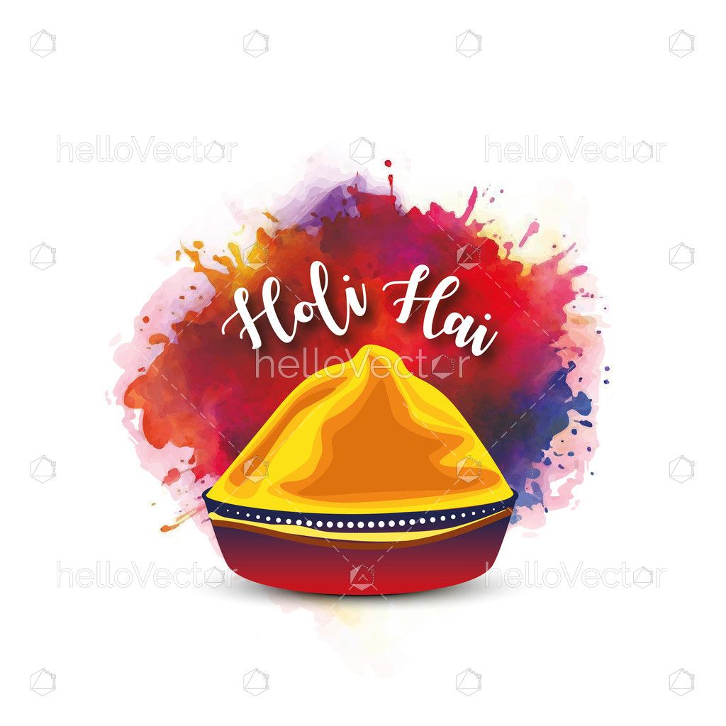 A vibrant Holi illustration featuring a bowl filled with bright yellow gulal set against a colorful splash background, capturing the excitement, energy, and festive spirit of the celebration.