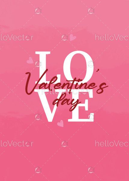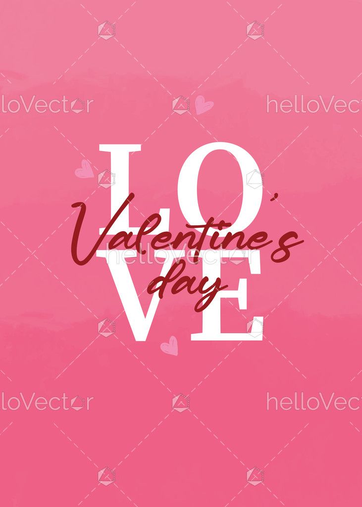 A romantic pink-themed typography design featuring the word “LOVE” with “Valentine’s Day” written in stylish script, decorated with small hearts to express romance, affection, and celebration of love.