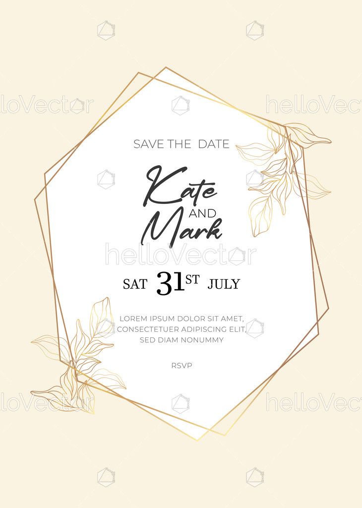 A stylish save-the-date wedding card featuring a clean white center with an elegant geometric gold outline and delicate line-art leaves. The couple’s names are highlighted in modern handwritten-style typography, along with the wedding date and RSVP text. The soft beige background and minimal floral accents create a sophisticated and contemporary look, ideal for weddings, engagements, and announcement cards.
