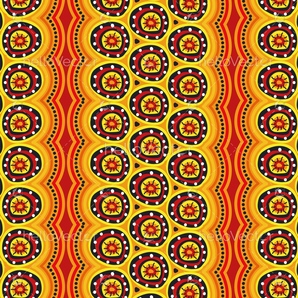 A bold, repeating design featuring sun-like motifs in red, yellow, and black, arranged within flowing, wave-shaped borders for a lively, cultural aesthetic. The background is a vector graphic, which means it can be scaled and edited without losing quality.